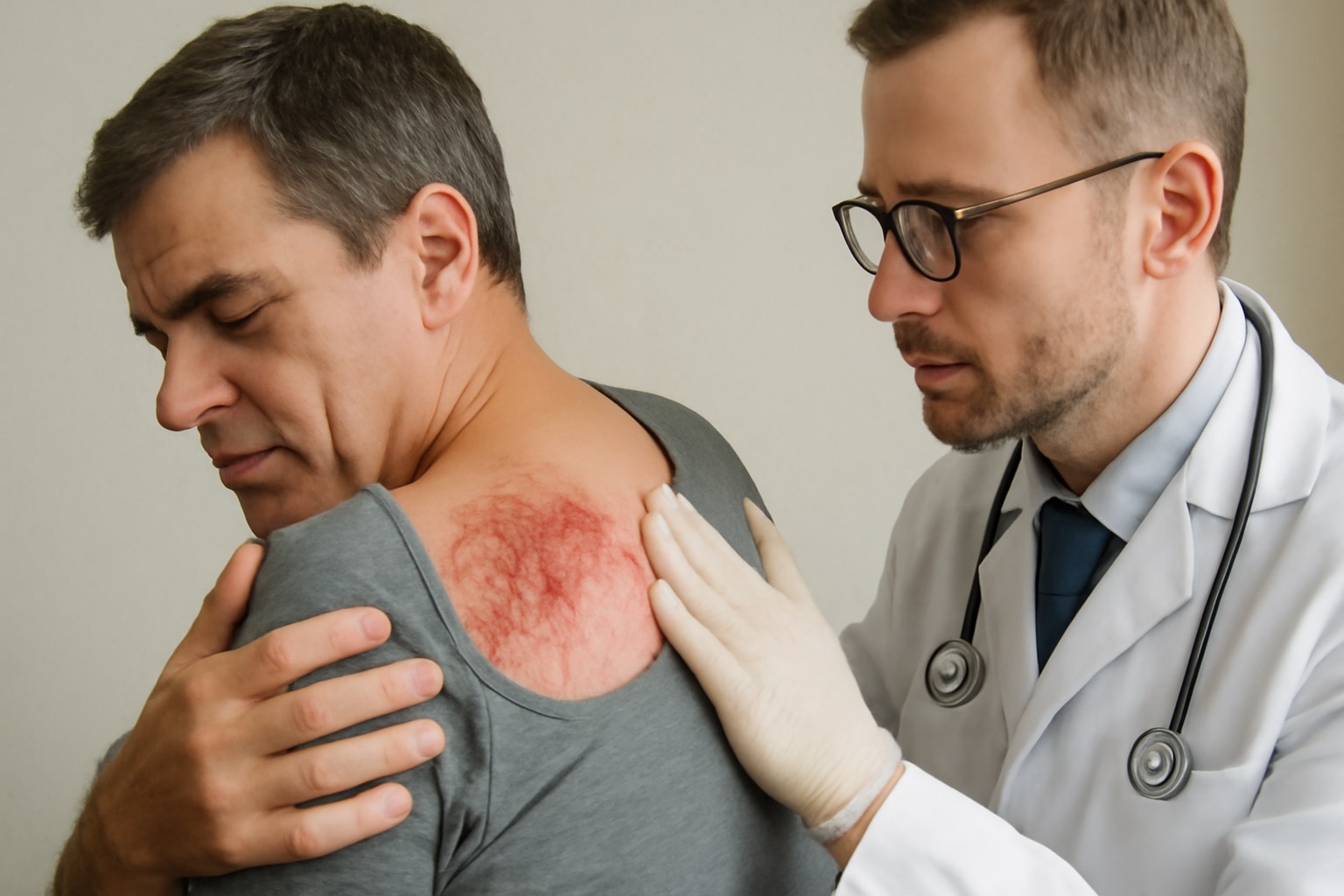 Vị trí phát ban: Các mảng phát ban thường xuất hiện dọc theo một dây thần kinh, thường là ở vùng ngực, lưng, mặt, hoặc cổ.